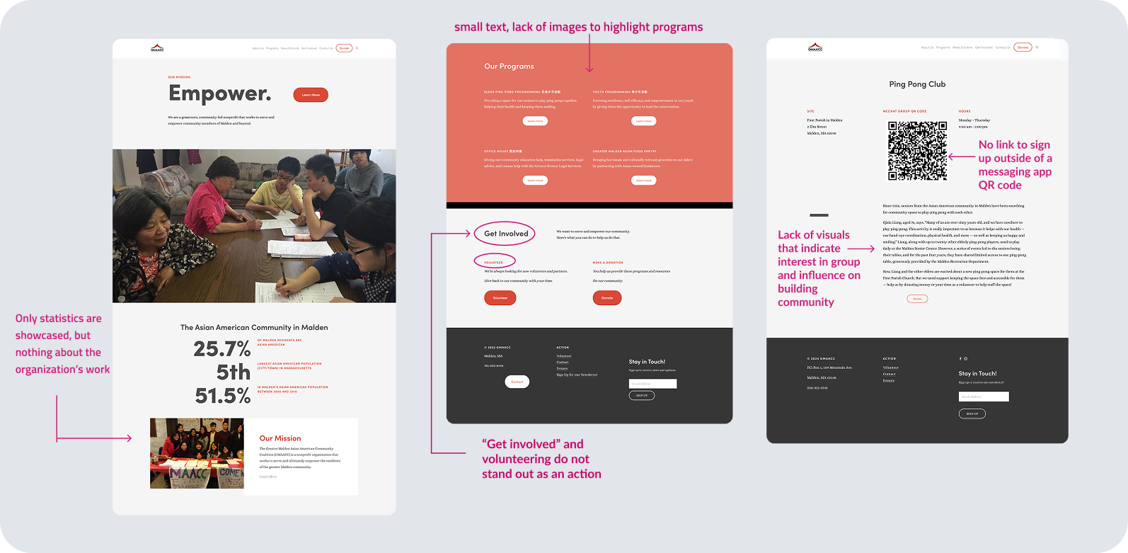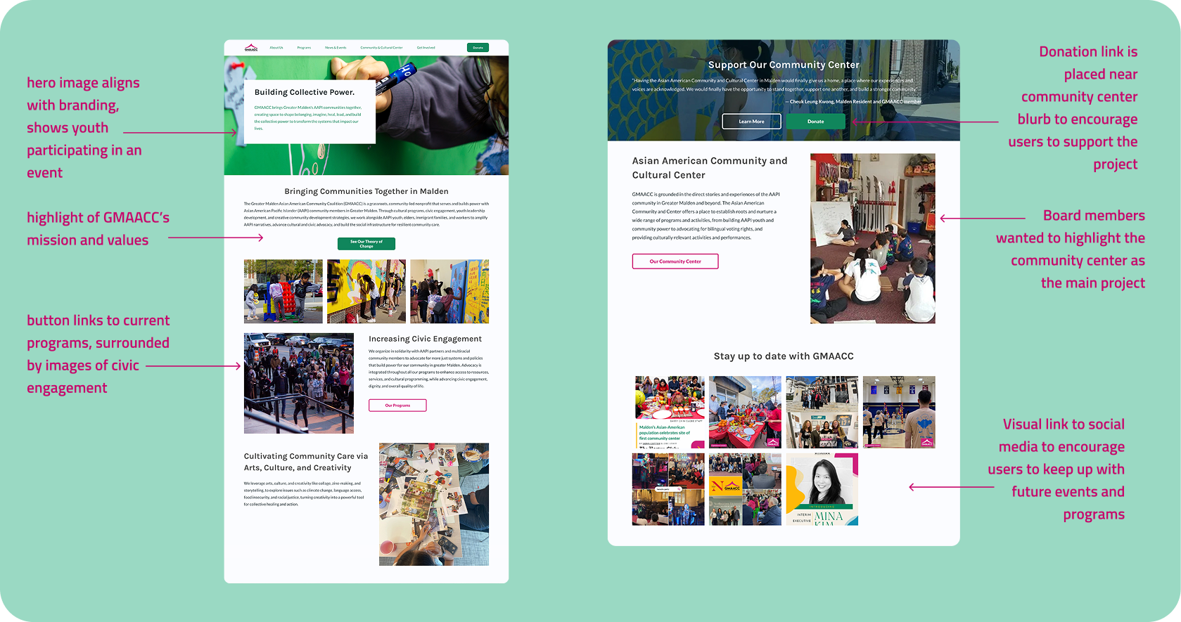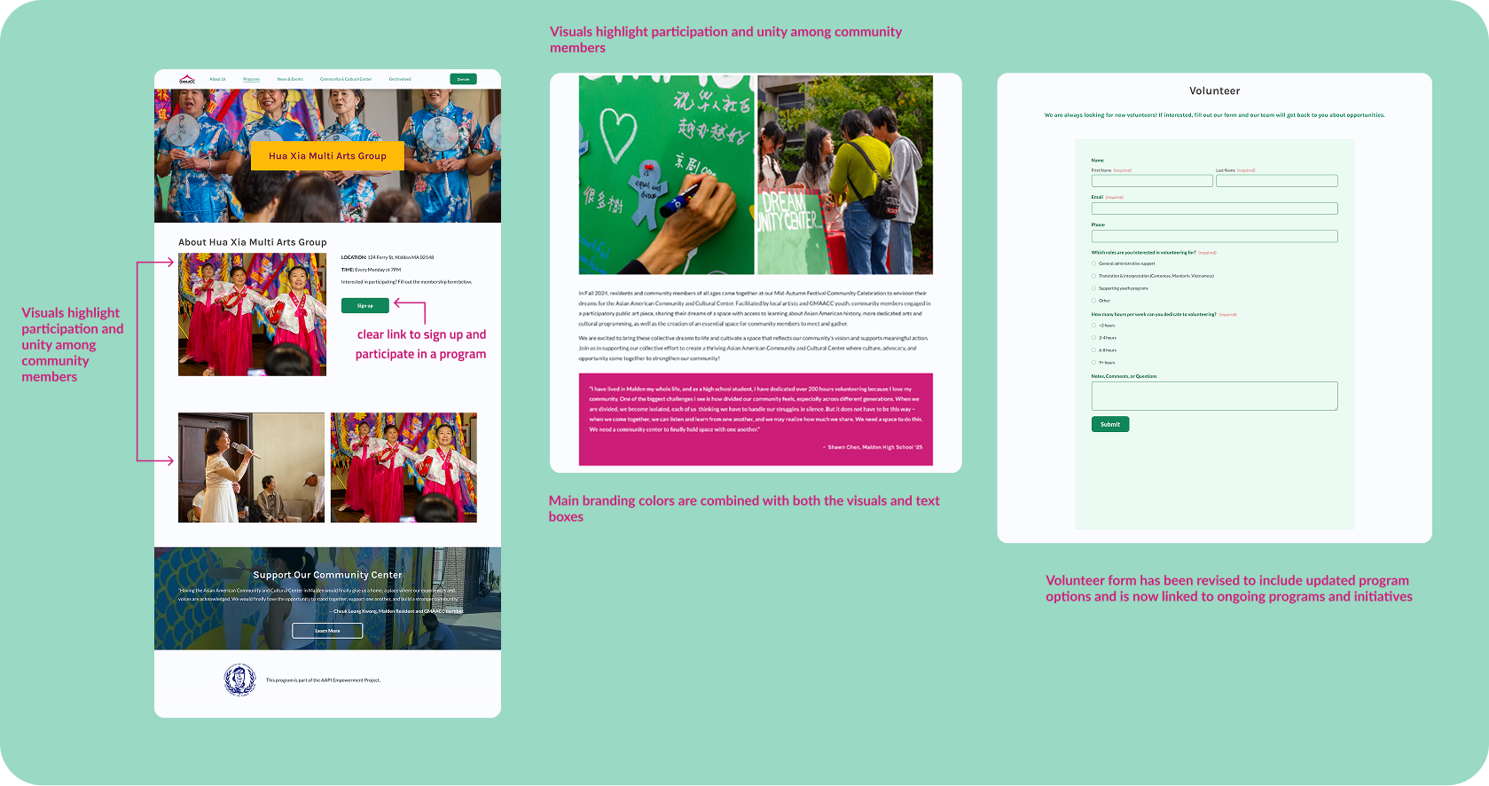 • Program photos were chosen to match the website’s theme, along with the organization’s focus on highlighting their civic engagement efforts, programming, and initiatives for grant-funding
