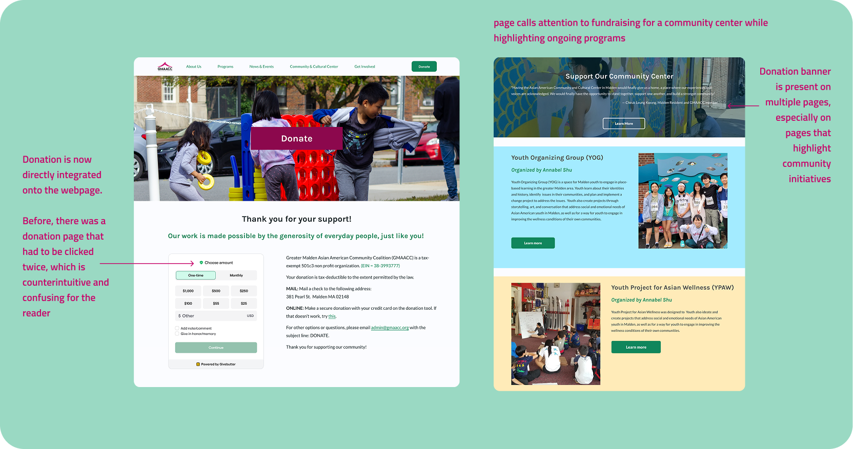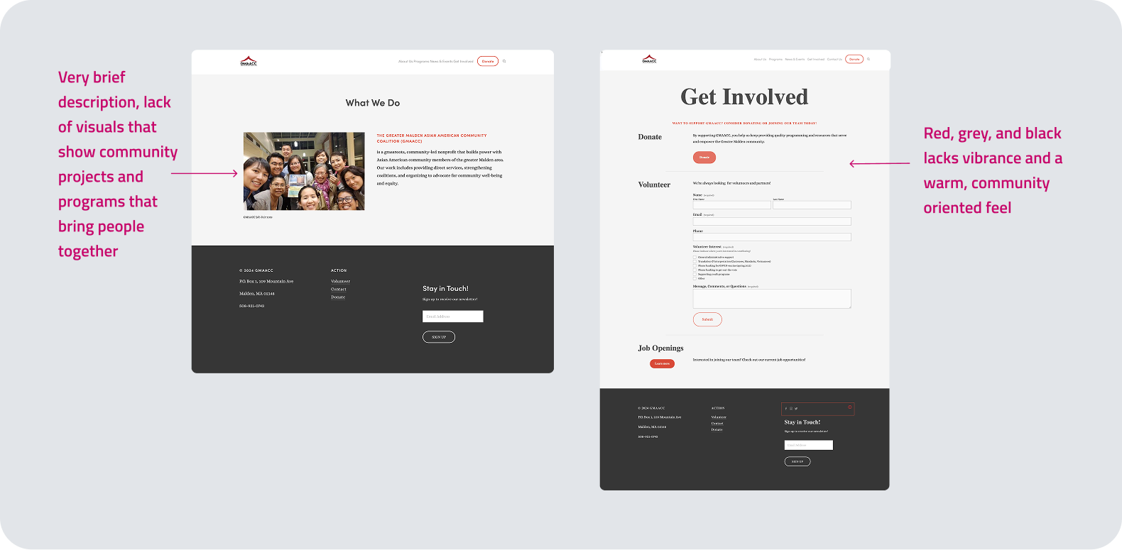 In early 2025, GMAACC started fundraising for their community center set to be built over the summer. The organization’s website had been outdated for a while and was due for a re-brand. Due to upcoming grant applications and donation needs, the staff were on a strict timeline to get their website ready to go.
